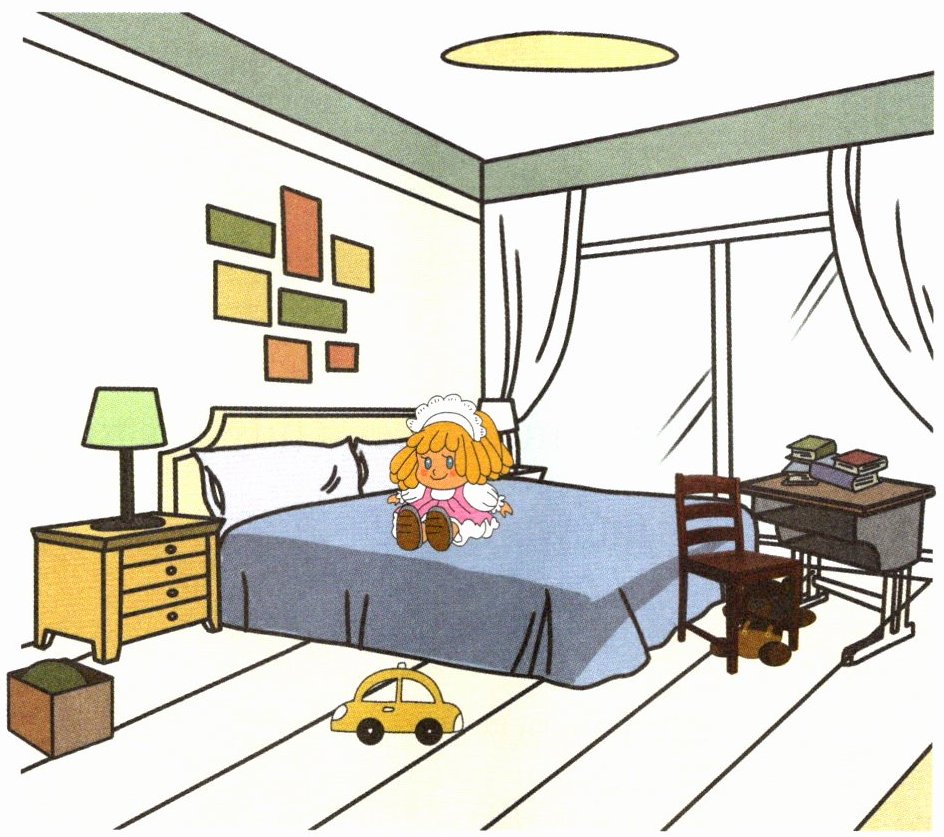( ) 3. The doll is on the bed.