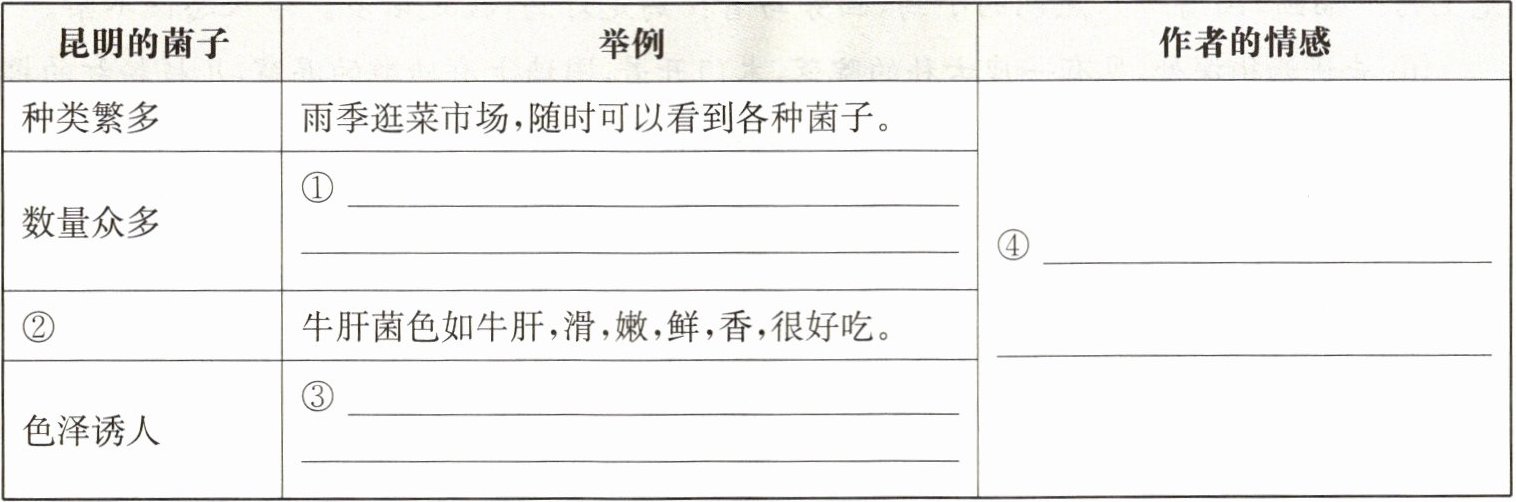 5 不能替换。“爬”字赋予木香人或动物的情态,生动形象地表现出木香的茂盛,表达了作者的喜爱、赞叹之情。 【点拨:本题考查句子的语言表现力。首先应判断句子语言的形式特点,本句运用比拟手法,分析这样的修辞手法写出了木香怎样的特点,最后再分析作者的情感。】 6 ① 家家饭馆卖炒牛肝菌,连西南联大食堂的桌子上都可以有一碗。 ② 味道鲜美 ③ 这种菌子炒熟了也还是浅绿色的,格调比牛肝菌高。 ④ 对昆明的雨的喜爱,对昔日生活的怀念。 7 这句话写出了热情善良的房东送给“我”缅桂花,让“我”心生感动,表达了“我”对缅桂花的喜爱之情及对昆明雨季的怀念之情。 8 “情味”有雨引起的淡淡乡愁,也有雨中美景令人陶醉之闲适,更有幽静、恬淡之感。