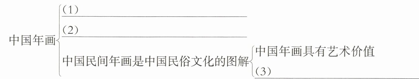 $中国年画\begin{cases}(1)$_________$\\(2)$_________$\\中国民间年画是中国民俗文化的图解\begin{cases}中国年画具有艺术价值\\(3)$_________$\end{cases} \end{cases}$