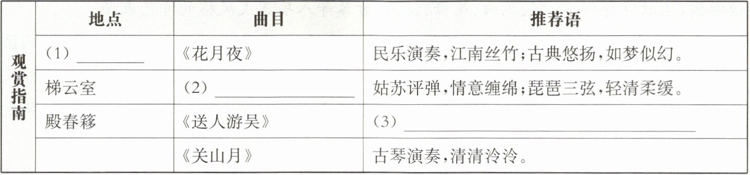 9 网师园迎来了一批游客,他们对网师园夜游活动中的“器乐”表演很感兴趣。讲解员设计了一份观赏指南,请你根据文章内容补充完整。