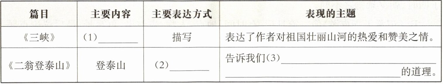 14 《三峡》与《二翁登泰山》在主要内容、表达方式和表现的主题上有什么不同?请完成下面的表格。
