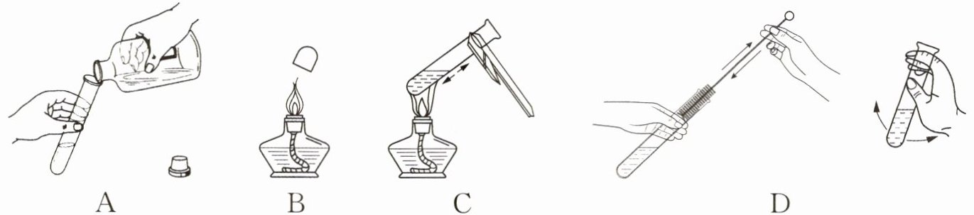 焰对准试剂所在部位加热。(4) 如图D所示,试管内壁附有不易洗掉的物质时,可用