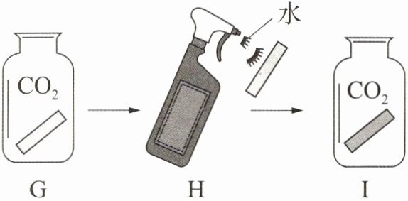 (3)将干燥的石蕊试纸放入充满$CO_{2}$的集气瓶中(如图G),再取出向干燥的石蕊试纸上喷水(如图H),将湿润的石蕊试纸再放入充满$CO_{2}$的集气瓶中(如图I)。能观察到石蕊试纸变红的是