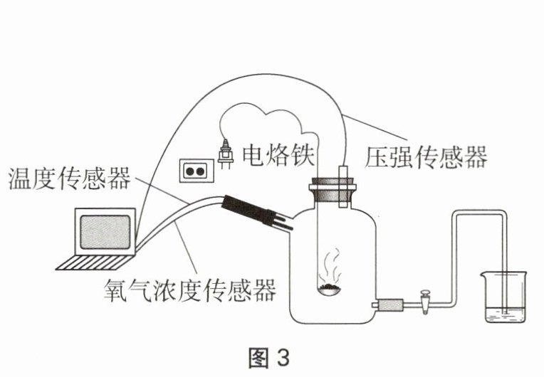 【探究和分析】实验小组设计了图3装置,通过加热电烙铁引燃燃烧匙内的过量红磷,利用传感器测定实验过程中装置内不同时间点的压强、温度和氧气浓度,绘制得到了三条曲线,变化趋势如图4所示。