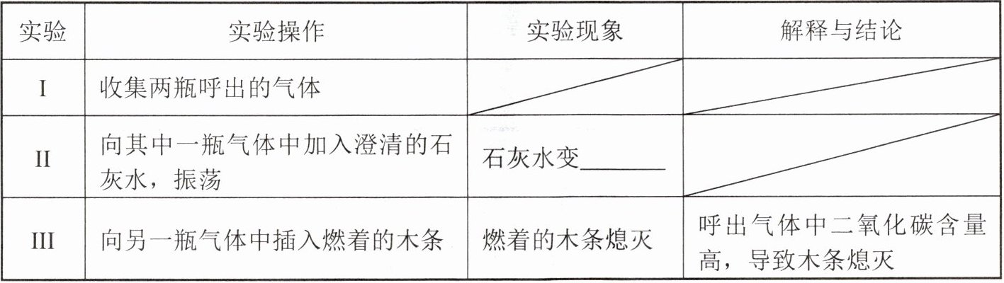 | || III | 向另一瓶气体中插入燃着的木条 | 燃着的木条熄灭 | 呼出气体中二氧化碳含量高,导致木条熄灭 |