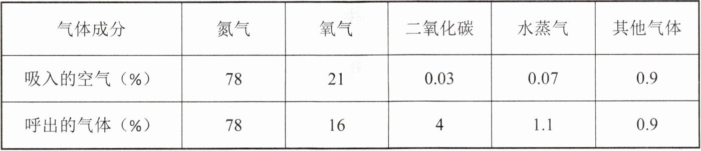 | 吸入的空气(%) | 78 | 21 | 0.03 | 0.07 | 0.9 |