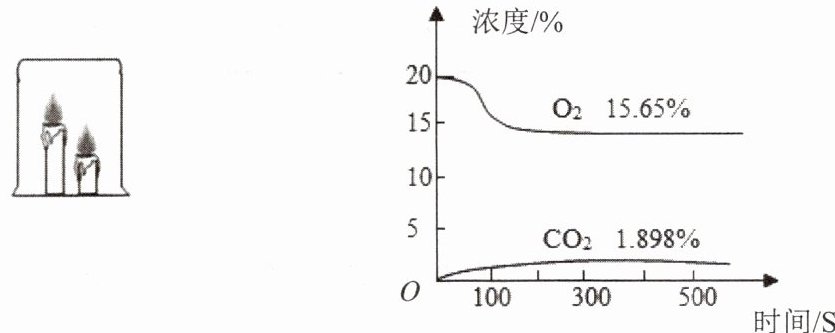 ②用氧气、二氧化碳传感器在烧杯顶部测量杯内两支蜡烛从点燃到全部熄灭后,杯内氧气和二氧化碳的浓度变化如图: