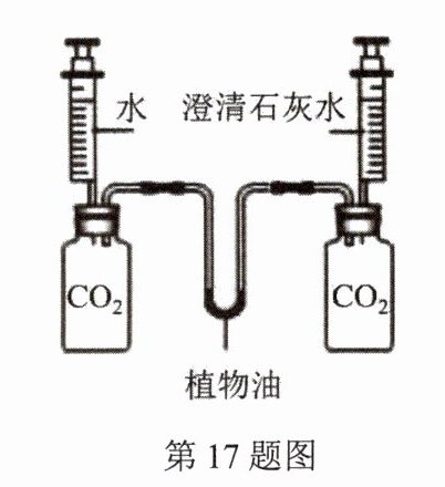 17.如图所示在两瓶相同体积的二氧化碳气体中,同时加入等体积的水和澄清石灰水,充分振荡后,以下