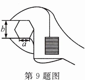 9. 新考向 真实情境(教材九上 P108 习题 T5 变式)如图,工人师傅用扳手拧形状为正六边形的螺帽,现测得扳手的开口宽度 $b = 3\mathrm{cm}$,则螺帽边长 $a =$