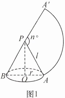 步骤1:如图1,将一个底面半径为 $r$ 的圆锥侧面展开,可得到一个半径为 $l$、圆心角为 $n^{\circ}$的扇形。制作圆锥形生日帽时,要先确定扇形的圆心角度数,再度量裁剪材料。