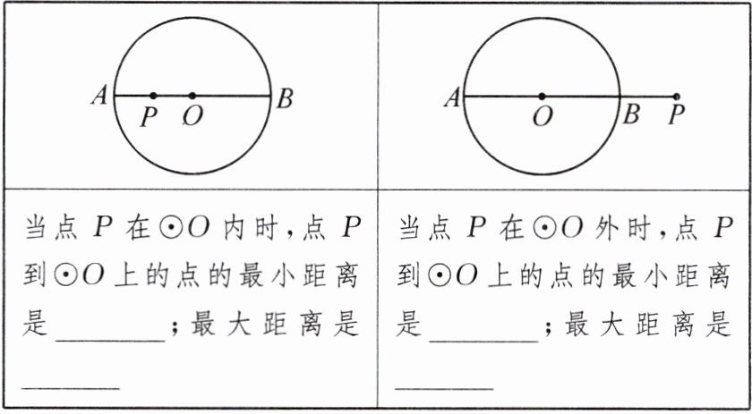 本题可根据点与圆的位置关系,结合图形来确定点$P$到$\odot O$上的点的最小距离和最大距离。