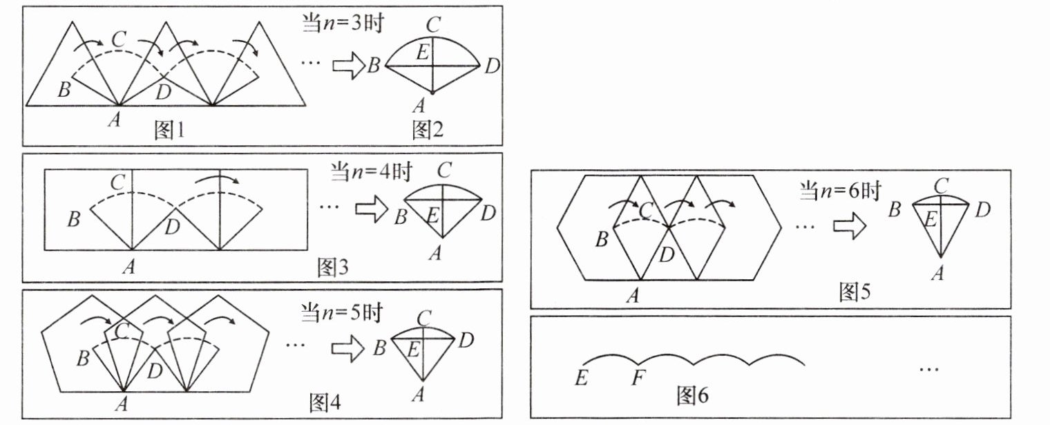,这样车辆行驶平稳、没有颠簸感.所以将车轮设计成圆形.(3)若路面是如图 6 所示的形状,可看成由半径为 2 的一些等弧首尾连接而成,$\overset{\frown}{EF}$的长为$\frac{\pi}{9}$,为确保车轮平稳滚动,则该车轮应设计成边数为几的正多边形?
