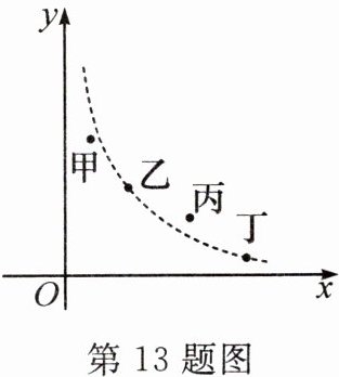 13. 新考向 真实情境 某市举行中学生党史知识竞赛,如图用四个点分别描述甲、乙、丙、丁四所学校竞赛成绩的优秀率(该校优秀人数与该校参加竞赛人数的比值)$ y $ 与该校参加竞赛人数 $ x $ 的情况,其中描述乙、丁两所学校情况的点恰好在同一个反比例函数的图象上,则这四所学校在这次党史知识竞赛中成绩优秀人数最多的是 (