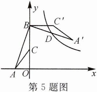 5. 如图,点 $ A $ 的坐标是 $ (-2, 0) $,点 $ B $ 的坐标是 $ (0, 6) $,$ C $ 为 $ OB $ 的中点,将 $ \triangle ABC $ 绕点 $ B $ 逆时针旋转 $ 90^{\circ} $ 后得到 $ \triangle A'BC' $。若反比例函数 $ y = \dfrac{k}{x} $ 的图象恰好经过 $ A'B $ 的中点 $ D $,则 $ k $ 的值是