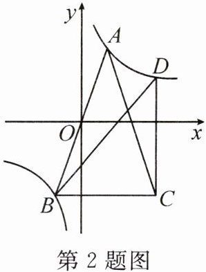 2. 如图,$ \triangle ABC $ 是等腰三角形,$ AB $ 过原点 $ O $,底边 $ BC // x $ 轴,双曲线 $ y = \dfrac{k}{x} $ 过 $ A $,$ B $ 两点,过点 $ C $ 作 $ CD // y $ 轴交双曲线于点 $ D $。若 $ S_{\triangle BCD} = 8 $,则 $ k $ 的值是