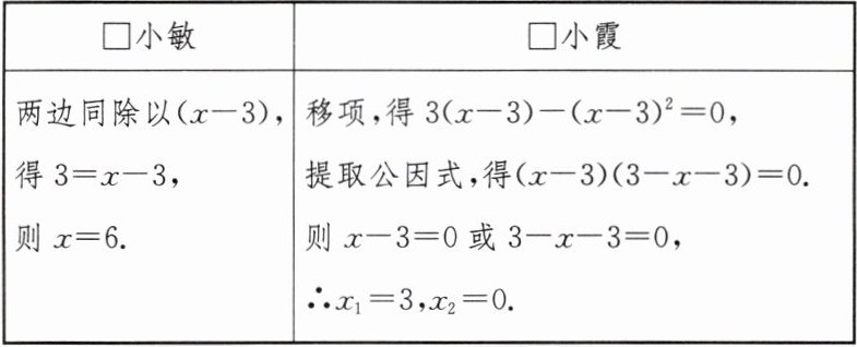 8.解:小敏:$×$;小霞:$×$。正确的解答:移项,得$3(x - 3) - (x - 3)^2 = 0$,提取公因式,得$(x - 3)(3 - x + 3) = 0$。则$x - 3 = 0$或$3 - x + 3 = 0$,$\therefore x_1 = 3,x_2 = 6$。