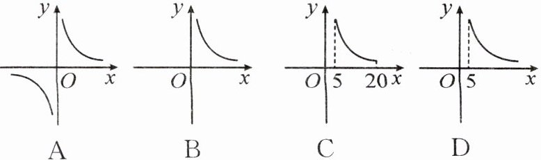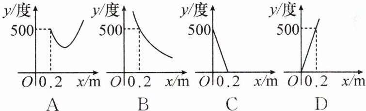 2. “科学用眼,保护视力”是青少年珍爱生命的具体表现.科学证实:近视眼镜的度数 $ y $ (度) 与镜片焦距 $ x(m) $ 成反比例函数关系.若 500 度近视镜片的焦距为 $ 0.2 m $,则表示 $ y $ 与 $ x $ 之间的函数关系的图象大致是(