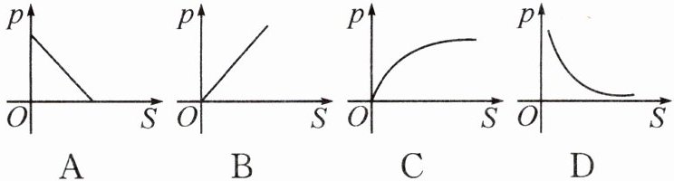 1. (2024·广西大学附中模拟)已知压力 $ F(N) $、压强 $ p(Pa) $ 与受力面积 $ S(m^2) $ 之间有如下关系式:$ F = pS $。当 $ F $ 为定值时,则表示压强 $ p $ 与受力面积 $ S $ 之间函数关系的图象大致是(