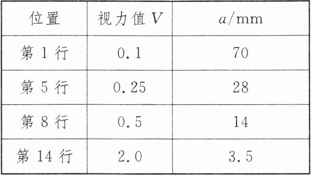 ②小明在制作过程中发现,某行字母 E 的宽度 a 的值为 17.5 mm,请问该行对应的视力值是多少?