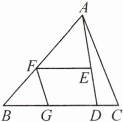 13. 如图,$D$是$\triangle ABC$边$BC$上一点,连接$AD$,过$AD$上的点$E$作$EF // BD$,交$AB$于点$F$,过点$F$作$FG // AC$,交$BC$于点$G$,已知$\frac{AE}{ED} = \frac{3}{2}$,$BG = 4$。