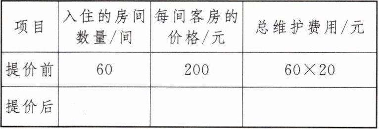 【问题情境】某青年旅社有 60 间客房供游客居住,在旅游旺季,当每间客房的定价为每天 200 元时,所有客房都可以住满。每间客房的定价每提高 10 元,就会有 1 间客房空闲,对有游客人住的客房,旅社还需要对每个房间支出 20 元/天的维护费用。设每间客房的定价提高了 $ x $ 元。