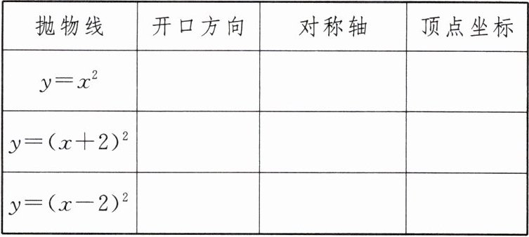 1. (1) 在如图所示的平面直角坐标系中画出函数 $ y = x^2 $,$ y = (x + 2)^2 $,$ y = (x - 2)^2 $ 的图象。