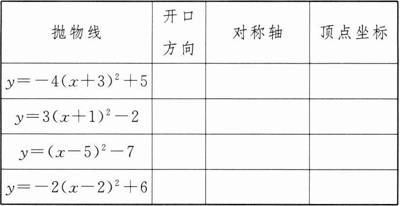 1. (教材九上 P37 练习变式)填写下列抛物线的开口方向、对称轴及顶点坐标.