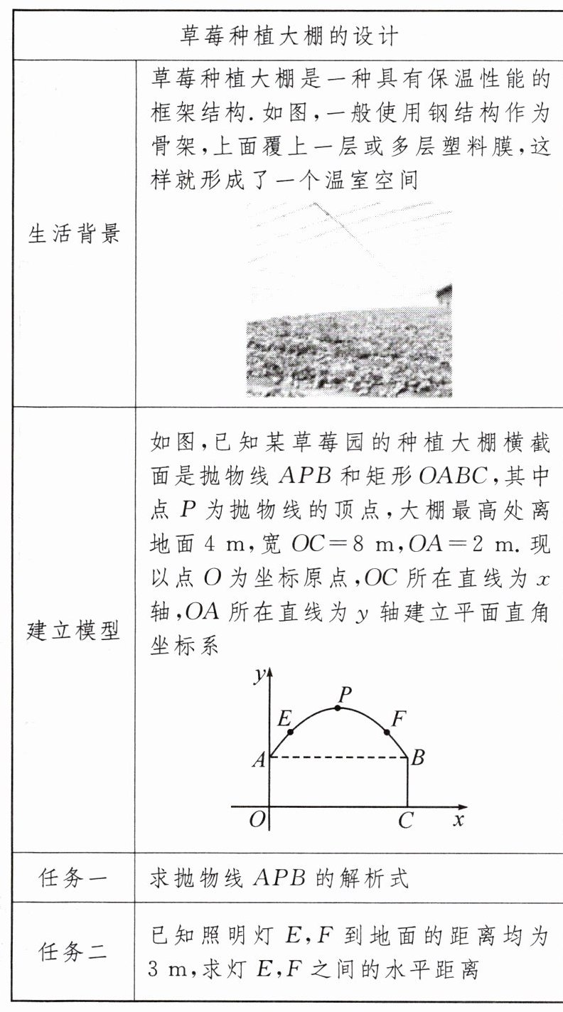 9.解:任务一:由题意可知,抛物线的顶点为$P(4,4)$且过点$A(0,2)$。设抛物线的解析式为$y = a(x - 4)^2 + 4$。将$A(0,2)$代入,得$2 = 16a + 4$,解得$a = - \frac{1}{8}$。抛物线的解析式为$y = - \frac{1}{8}(x - 4)^2 + 4$。任务二:当$y = 3$时,$- \frac{1}{8}(x - 4)^2 + 4 = 3$,解得$x = 4 \pm 2\sqrt{2}$。$E,F$的横坐标分别为$4 - 2\sqrt{2},4 + 2\sqrt{2}$。$EF = 4\sqrt{2}$m。答:灯$E,F$之间的水平距离为$4\sqrt{2}$m。