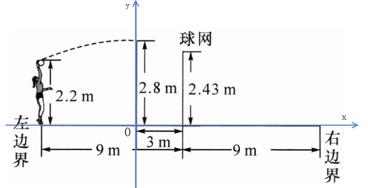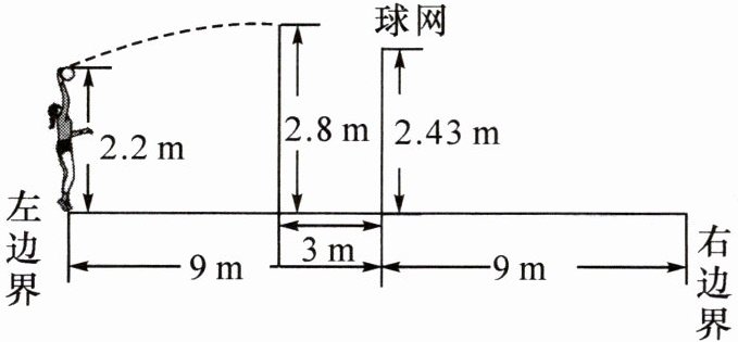 8. 如图,排球运动场的场地长 $ 18 \, m $,球网高 $ 2.43 \, m $,球网在场地中央,距离球场左、右边界均为 $ 9 \, m $. 一名球员在场地左侧边界练习发球,排球的飞行路线可以看作是对称轴垂直于水平面的抛物线的一部分. 某次发球,排球从左边界的正上方发出,击球点的高度为 $ 2.2 \, m $,当排球飞行到距离球网 $ 3 \, m $ 时达到最大高度 $ 2.8 \, m $. 小洛在图中建立了平面直角坐标系,求得该抛物线的解析式为 $ y = -\frac{1}{60}x^2 + 2.8 $. 根据以上信息,解答下列问题: