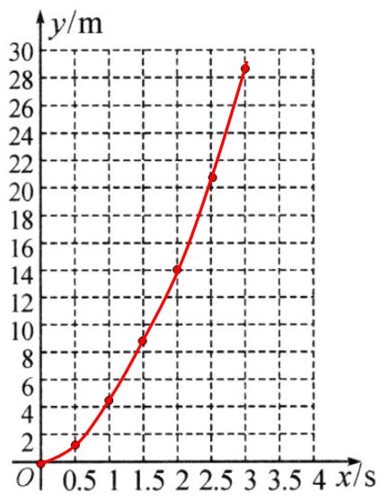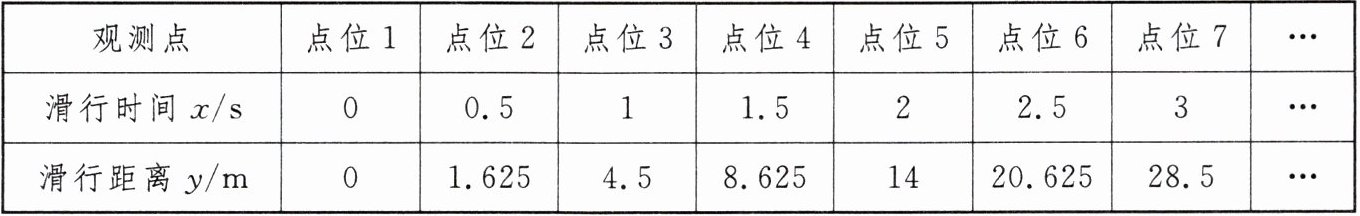 中国旅游研究院 2024 年 1 月 5 日发布的“2024 年冰雪旅游十佳城市”中,哈尔滨位列榜首,火爆出圈,其中帽儿山的滑雪运动深受欢迎. 滑雪爱好者小李为了得出滑行距离 $ y(m) $ 与滑行时间 $ x(s) $ 之间的关系,以便更好地享受此项运动带来的乐趣,他在滑道 $ A $ 上设置了若干个观测点,收集了一些数据,如下表所示: