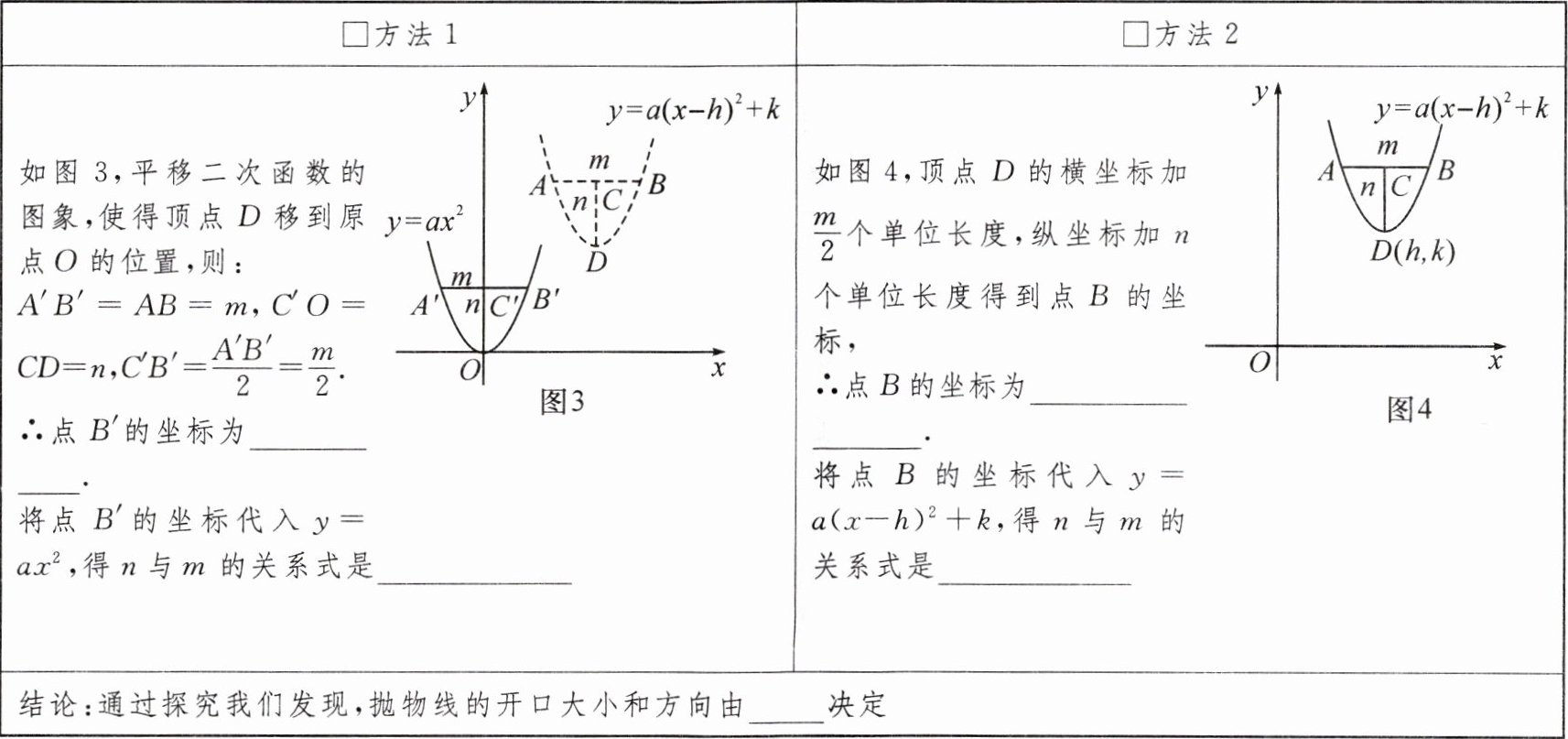 (2)探究小组又对多个二次函数的图象进行了测量研究,发现测得的n与m也存在类似的关系式,并针对二次函数y=a(x-h)²+k(a>0)的情况进行了推理验证.请从下表中任选一种方法(在“□”内打“√”)并补全其推理过程.(根据需要,选用字母a,m,n,h,k表示答案)