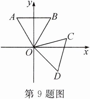 9. 如图,等边三角形 OAB 的顶点 O 为坐标原点,AB//x 轴,OA=2,将等边三角形 OAB 绕原点 O 顺时针旋转 105°至△OCD 的位置,则点 D 的坐标为