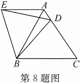 8. (2024·玉林期中)如图,在等边三角形 ABC 中,D 是边 AC 上的一点,将△BCD 绕点 B 逆时针旋转 60°得到△BAE. 若 BC=8,BD=6,则△AED 的周长为
