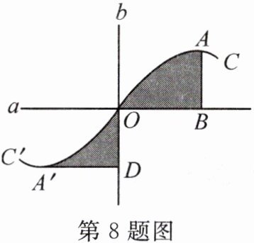 8. 【转化思想】如图,直线$a$,$b$垂直相交于点$O$,曲线$C$与曲线$C'$关于点$O$成中心对称,点$A$的对称点是点$A'$,$AB\perp a$,$A'D\perp b$.若$OB=3$,$OD=2$,则阴影部分的面积之和为