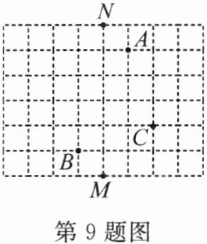 9. 在如图所示的方格纸中,每个小正方形的边长均为1.若以$MN$所在的直线为$y$轴(向上为正方向),小正方形的边长为1个单位长度建立平面直角坐标系,使点$A$与点$B$关于原点对称,则点$C$的坐标是