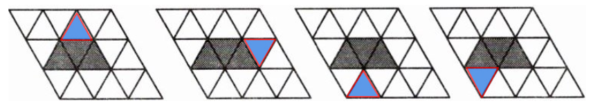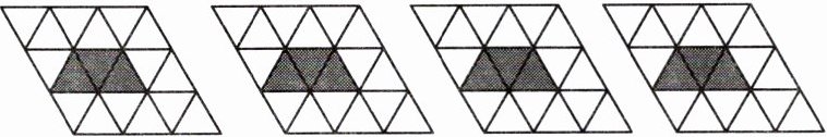 7. 数学活动课上,张老师组织同学们设计多姿多彩的几何图形,如图都是由边长为1的小等边三角形构成的网格,每个网格图中有3个小等边三角形已涂上阴影,请同学们在余下的空白小等边三角形中选取一个涂上阴影,使得4个阴影小等边三角形组成一个轴对称图形或中心对称图形,请画出4种不同的设计图形。(规定:凡通过旋转能重合的图形视为同一种图形)