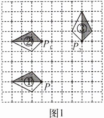 (1)图形①向上平移4格得到图形②;图形②以点$P_1$为旋转中心,顺时针旋转90°后,再向右平移4格得到图形③.