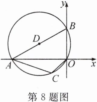 8. 如图,在平面直角坐标系 $xOy$ 中,点 $A$ 在 $x$ 轴负半轴上,点 $B$ 在 $y$ 轴正半轴上,$\odot D$ 经过 $A$,$B$,$O$,$C$ 四点,$\angle ACO = 120^{\circ}$,$AB = 4$,则圆心 $D$ 的坐标是