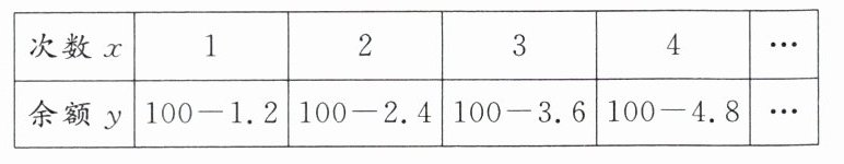 (2)当x=15时,$y=100-15×1.2=82$(元).答:小明乘15次车后还剩82元.