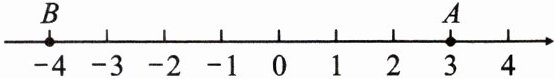 $A$点表示的数是$3$,$B$点表示的数是$-4$,则$A$、$B$两点之间的距离为:$\vert 3 - (-4)\vert=\vert 3 + 4\vert = 7$,即$A$,$B$两点之间有$7$个单位长度。