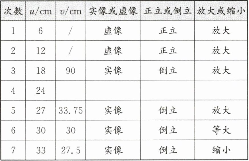 | 次数 | u/cm | v/cm | 实像或虚像 | 正立或倒立 | 放大或缩小 |