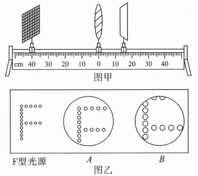 (4)将光屏放在凸透镜右侧,左右移动光屏,直至光屏上出现清晰的“F”字像,记录像距v、实像或虚像、正立或倒立、放大或缩小。