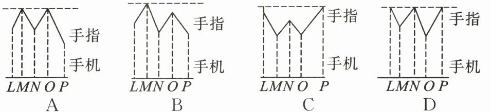 14. 超声波指纹识别属于第三代指纹识别技术,其工作原理与声呐探测海底深度类似。手指局部表面是凹凸不平的,某手机使用超声波指纹识别系统时,手机发出的超声波遇到手指上L、M、N、O、P五个位置,测得回收信号的时间分别为0.36ms、0.30ms、0.36ms、0.26ms、0.36ms。根据时间,求出不同位置与手机平面的距离,就可以绘出指纹的大致形状,则该处指纹的大致形状是图中的(