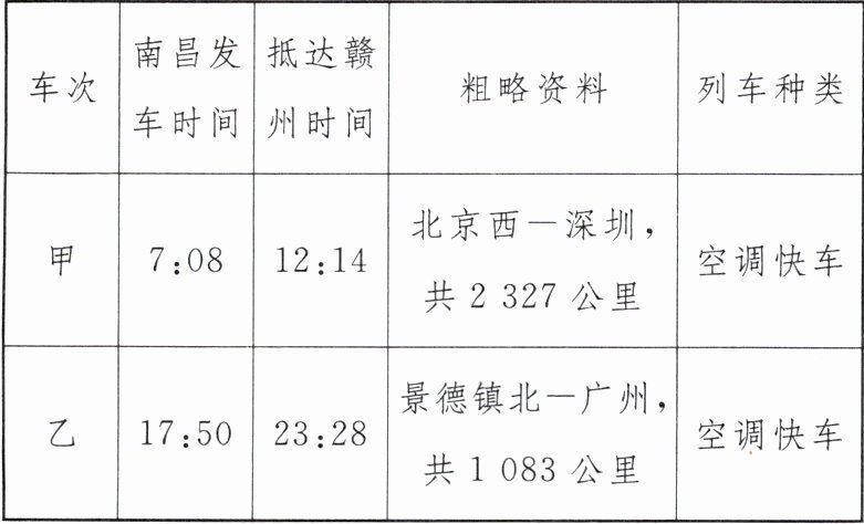 6. 小明的家在南昌,他的爸爸最近要去赣州办事,小明上网一查,发现从南昌到赣州的列车很多。下面是他查到的列车时刻表中的一部分,则坐甲次列车从南昌到赣州需要的时间是 (