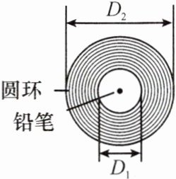3. 一条纸带厚薄均匀,若把纸带紧密地环绕在圆柱形铅笔上,恰好能套进一个圆环内。如图所示,纸带在铅笔上环绕了 $ n $ 圈,则纸带厚度是(用 $ D_1 $、$ D_2 $ 和 $ n $ 的表达式表示)。若实验时纸带没有紧密地环绕在铅笔上,会使测量值(填“偏大”“偏小”或“不变”)。