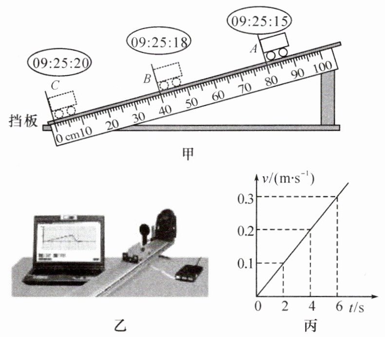 (填“增大”或“减小”)斜面倾角。(4) 小华改进实验,利用如图乙所示的位置传感器测出不同时刻小车与挡板的距离,并用计算机计算出小车在不同位置的速度。计算机绘制的图像如图丙所示,假设斜面足够长,则第 $ 5 \, s $ 时小车的速度为