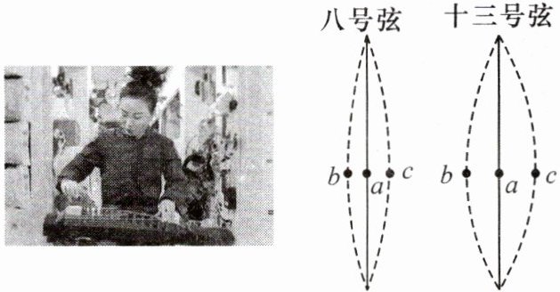 14. 如图所示,王亚平在“天宫”弹奏古筝,分别拨动古筝的八、十三号弦,用同一设置的相机拍摄到两弦最左摆到 b 处,最右摆到 c 处,静止时在 a 处。测出每振动 880 次,八号弦用时 2 s,十三号弦用时 4 s,则八号弦(