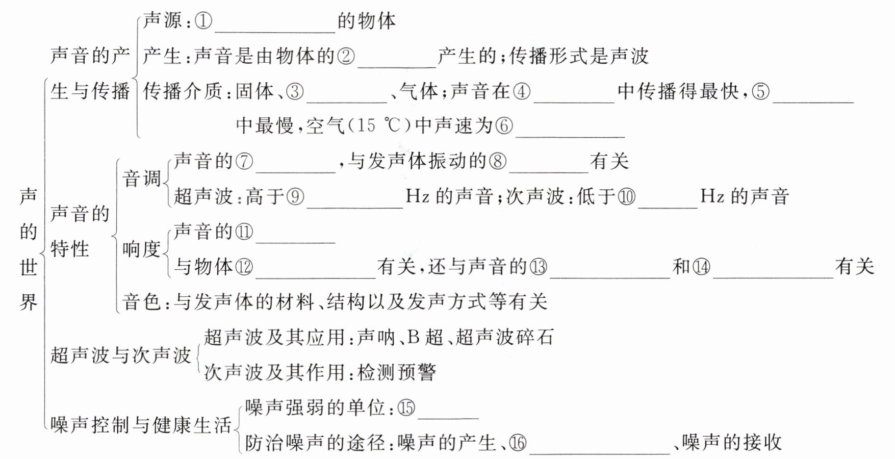①正在发声 ②振动 ③液体 ④固体 ⑤气体 ⑥340 m/s ⑦高低 ⑧频率 ⑨20 000 ⑩20 ⑪强弱 ⑫振动幅度 ⑬传播距离 ⑭分散程度 ⑮dB ⑯噪声的传播