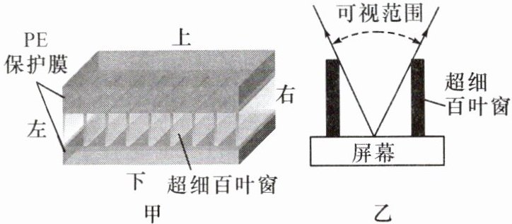 11. 工程实践 如图甲为手机防窥膜结构图,贴在手机屏幕上的效果如图乙,只有正对着手机屏幕的使用者才能看清楚屏幕上的内容,其他人从旁边望过去,只能看到一片漆黑,是由于光