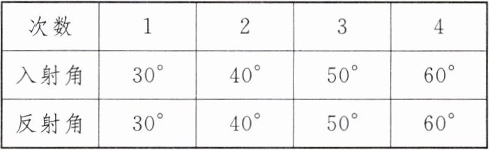 (填“靠近”或“远离”)平面镜。进行实验后的测量数据如下表,由此可得:在反射现象中,反射角等于入射角